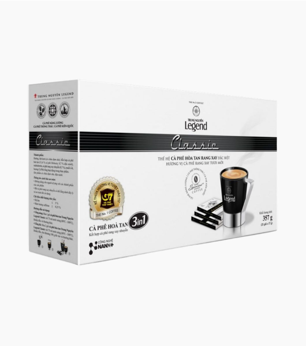 Kế thừa những tinh túy từ dòng sản phẩm cà phê hòa tan G7 trứ danh của Tập đoàn Trung Nguyên Legend: kết hợp những loại cà phê nguyên liệu tốt nhất thế giới cùng công nghệ NaNo và những bí quyết huyền diệu của Phương Đông, Trung Nguyên Legend Classic sở hữu lượng cà phê xay đặc trưng, thể chất mạnh cùng vị đắng đậm pha lẫn chút ngọt bùi đầy bản sắc.